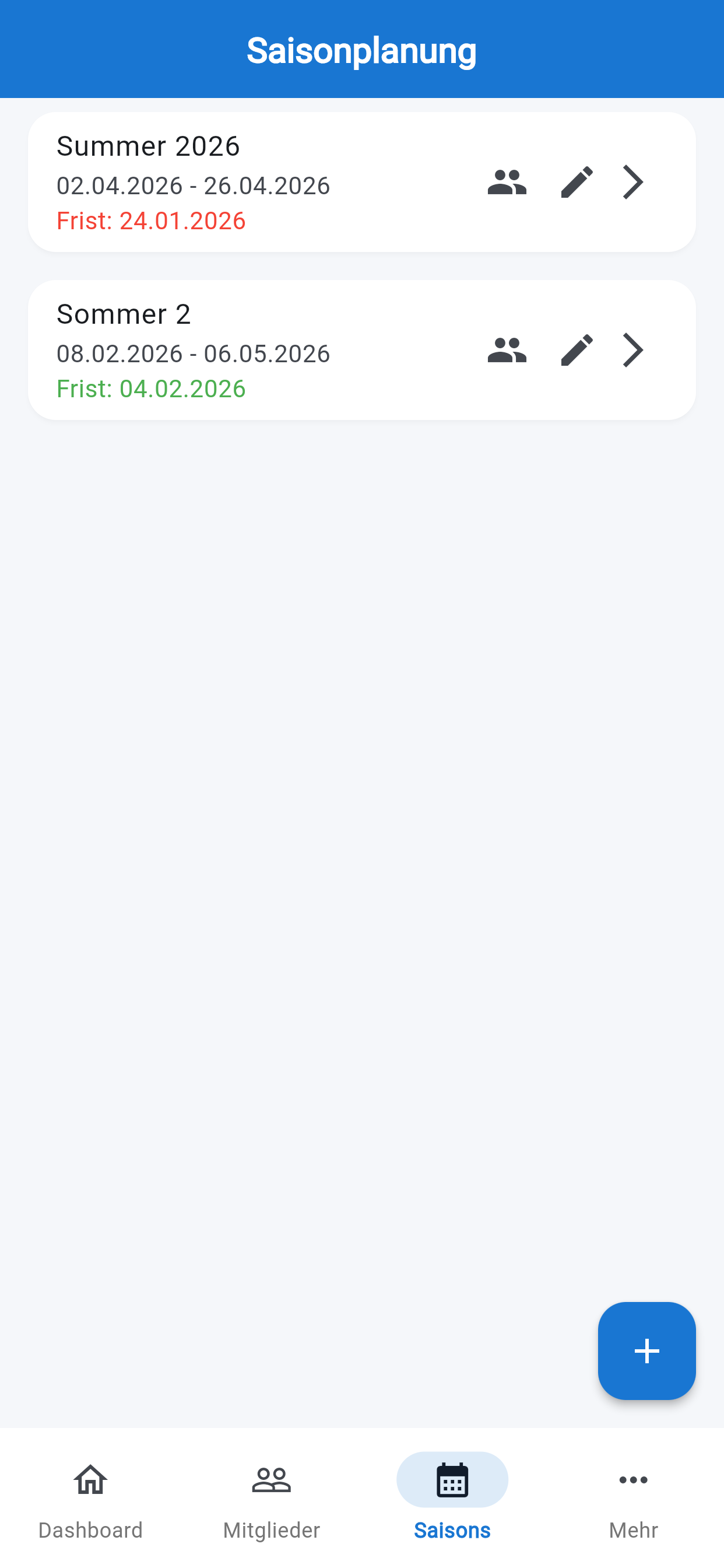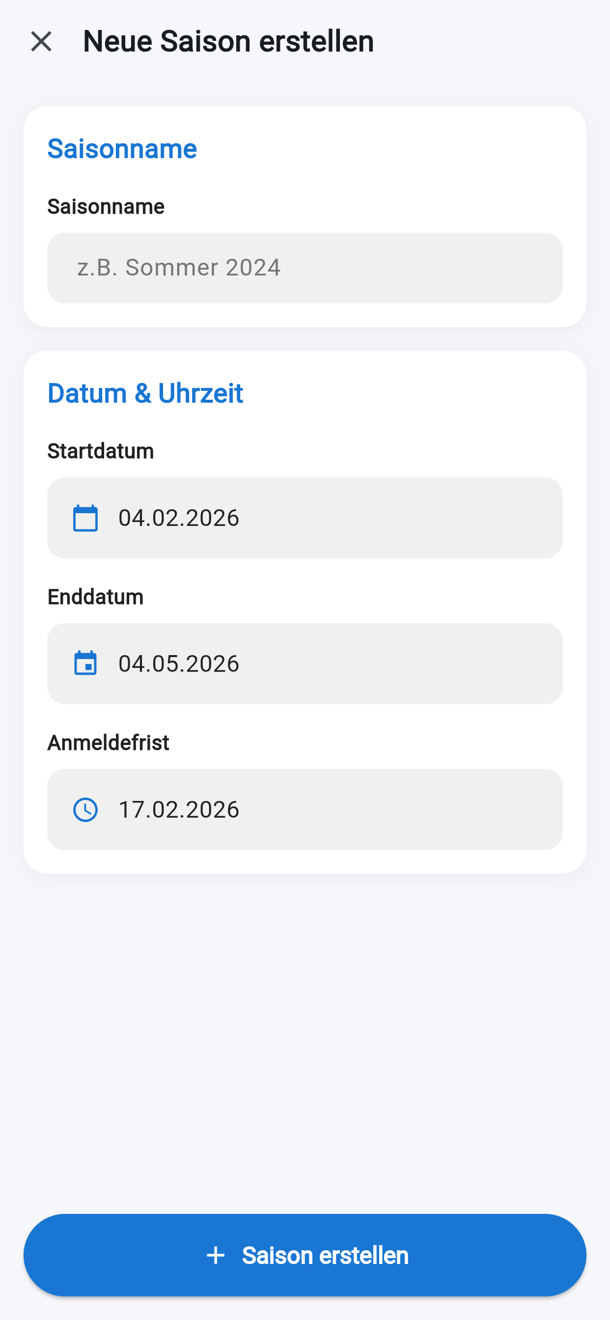 Strukturierte Erfassung von Saisons und Trainingsoptionen.
